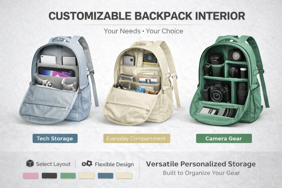 Flexible internal layouts with options such as laptop sleeves, shockproof padding, hidden pockets, USB ports, pen holders, and shoe compartments.