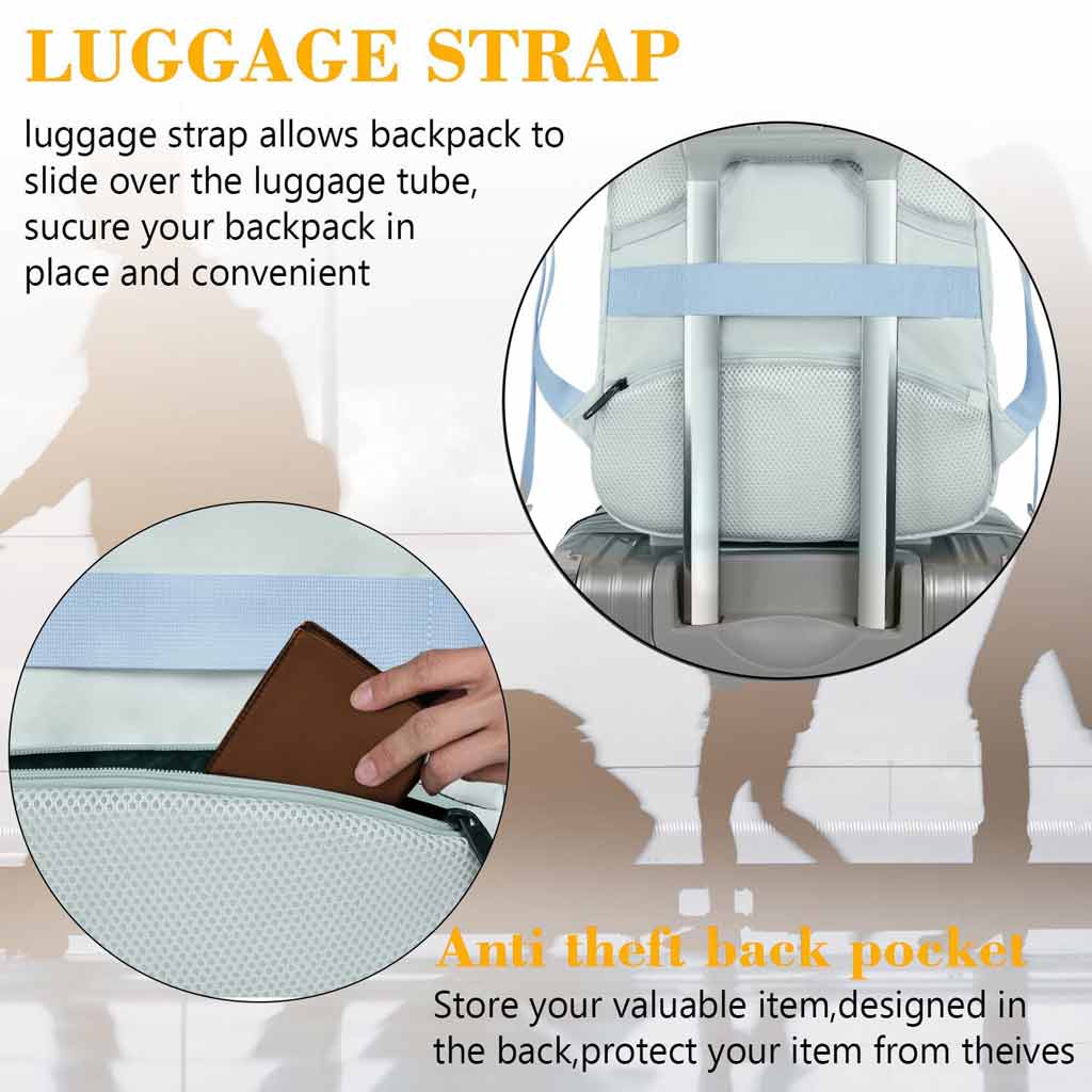 A luggage strap allows backpack fit on luggage/suitcase, slide over the luggage upright handle tube for easier carrying.