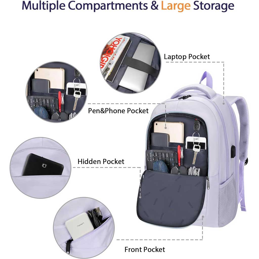 Front compartment with many pockets, pen pockets and key fob hook, makes your item organized and easier to find. Separate laptop compartments for iPad, wallet, clothes, bottles, umbrella, and various items.