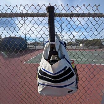 "I use this for pickleball and it works really well. Room for 2+ paddles, fits my size 12 shoes in the shoe pocket, drink pockets hold 1-liter bottles, sits upright on the ground without falling over, and hangs on the fence easily."