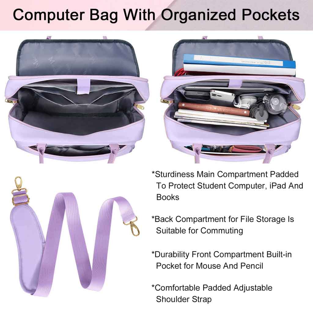 - PROTECCIÓN ACOLCHADA Y FUNCIONAL: El compartimento de la bolsa para computadora portátil para mujeres de 15,6 pulgadas está completamente acolchado. La funda morada para computadora portátil puede ofrecer la protección óptima para la computadora portátil. Cuenta con un acolchado de bolsa de mensajero morada para mujeres para golpes y protección de la computadora. bolsillos de bolsa grande para computadora portátil para mujeres hechos fácilmente para viajes de negocios o desplazamientos diarios