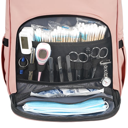 An organizer pocket hold small nursing stuff like tweezers, forceps. Besides, there are still a front pocket, an anti-theft pocket and two elastic side pockets.