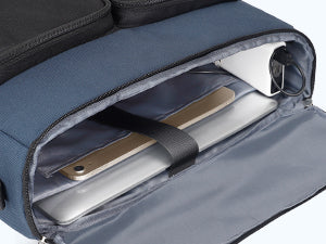 The main compartment of this messenger bag features a dual zipper closure flap, allowing adjustable opening size to prevent items from falling out.