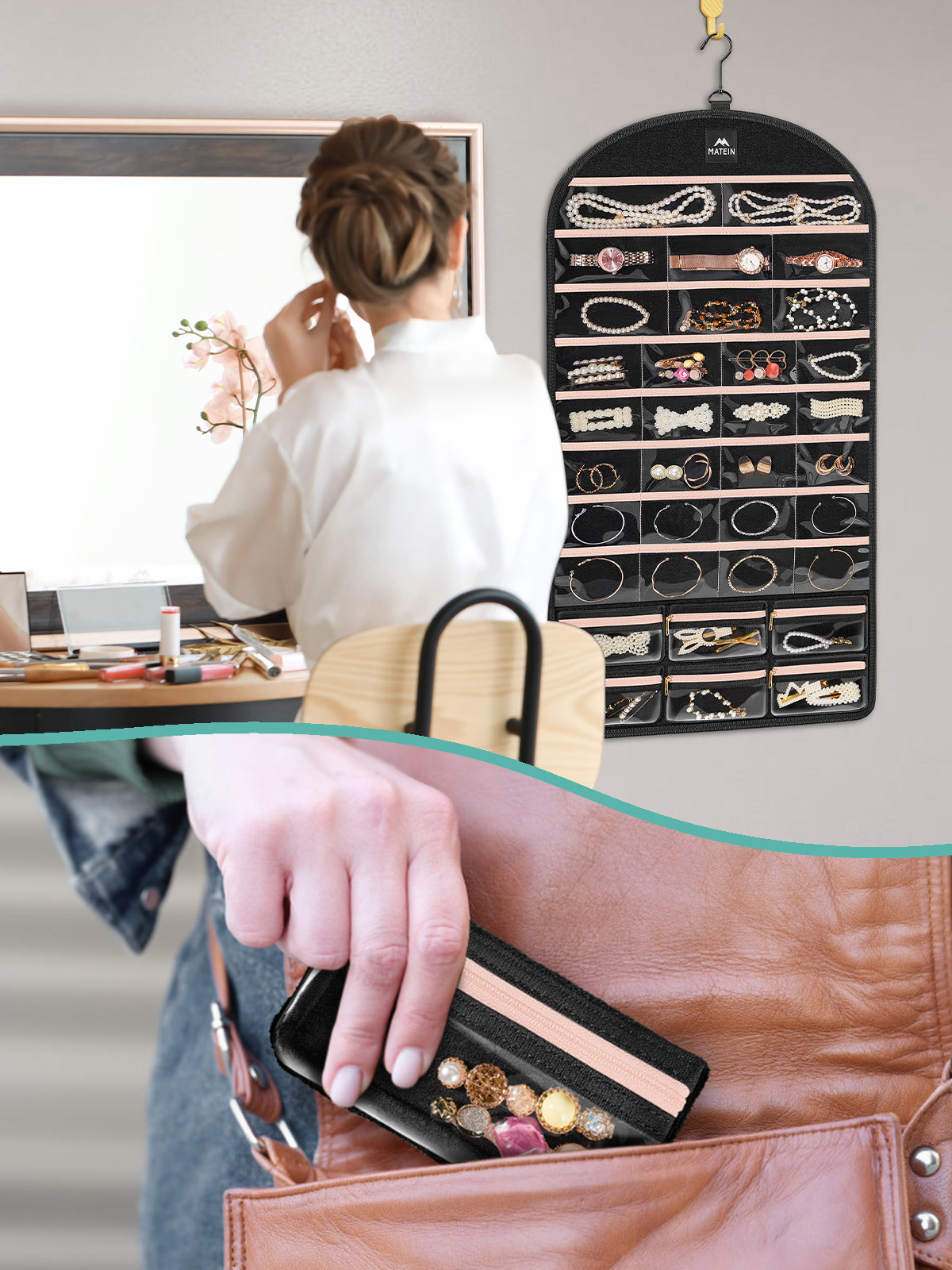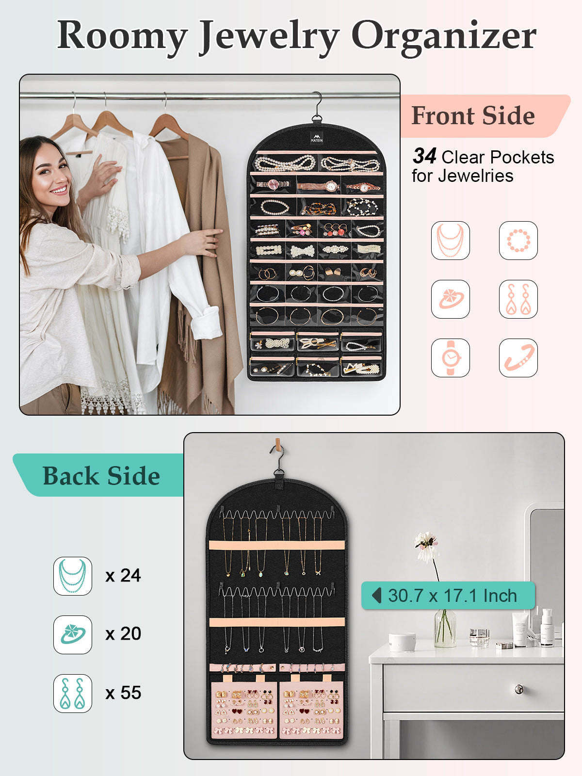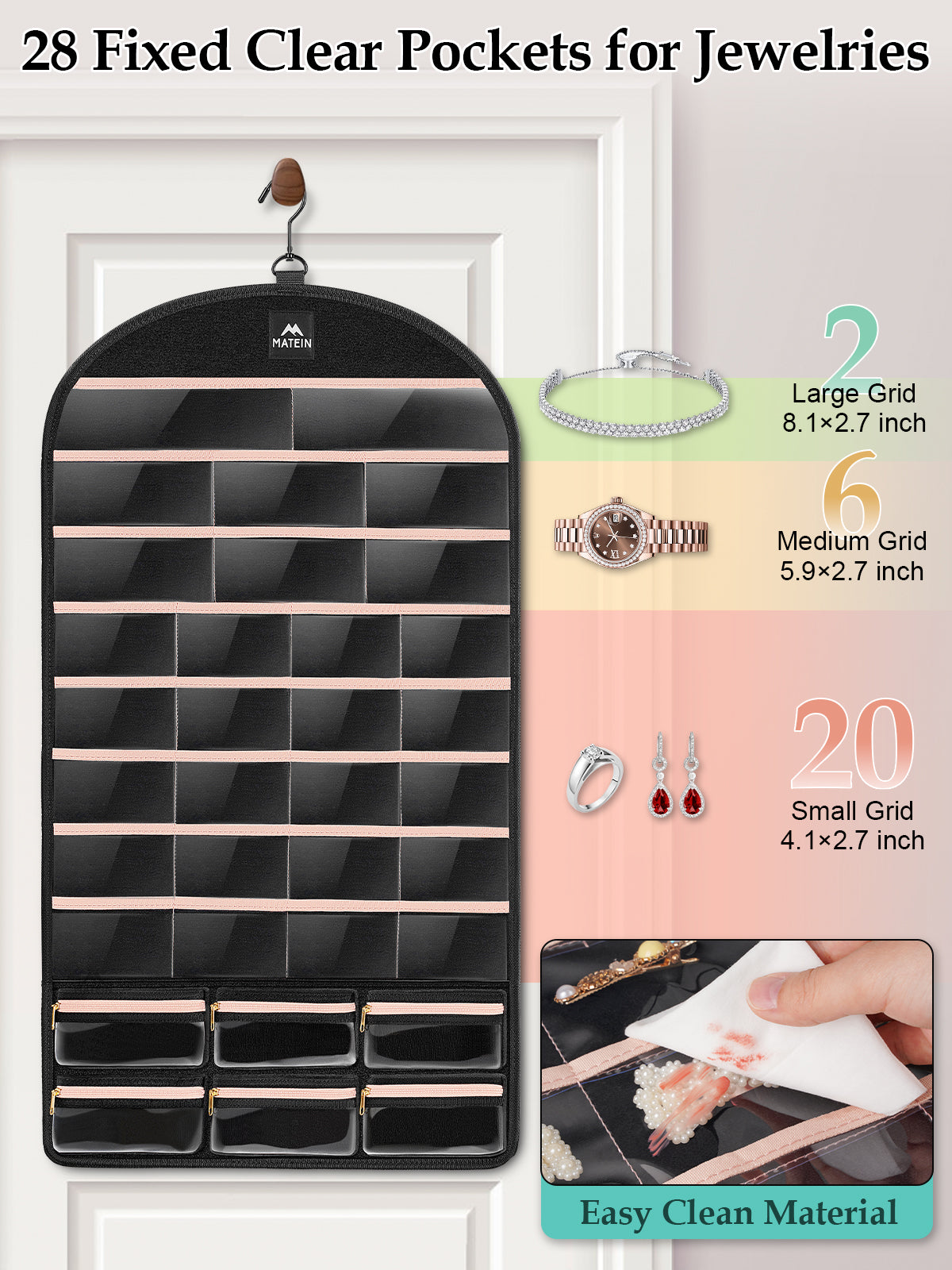Hanging jewelry organizer has 28 fixed pockets in 3 sizes, offering ample space to store all kinds of jewelry with neat, well-organized access.