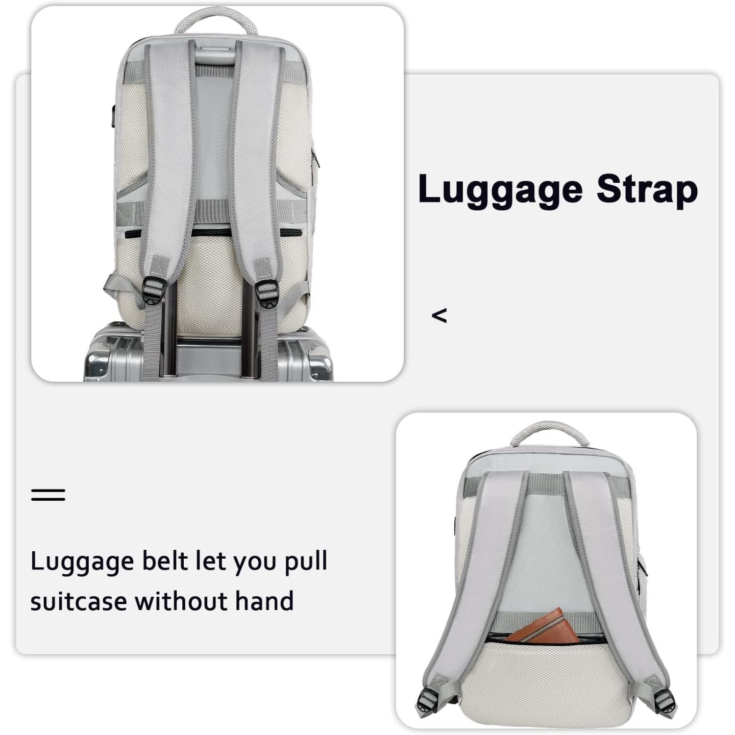 A luggage strap allows the travel backpack to securely slip over the handle of any rolling luggage.