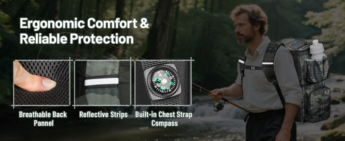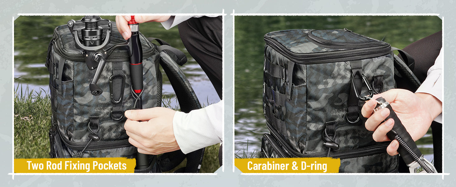 Waterproof 900D bottom with anti-slip rubber feet protects gear from wet surfaces and prevents sliding on boat decks or muddy shores.