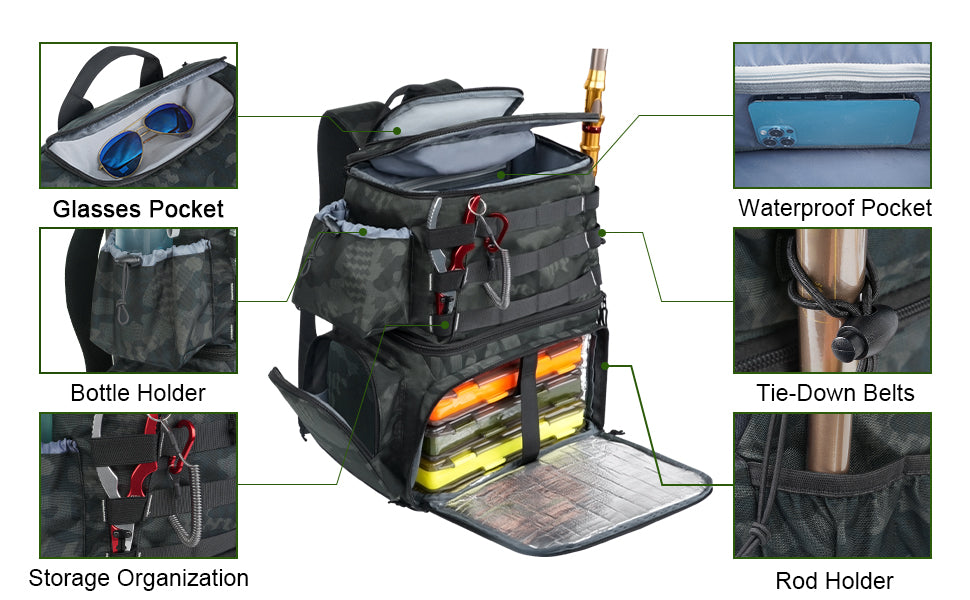 It is designed for anglers who demand both function and durability. With spacious compartments for tackle boxes, rod holders, and waterproof pockets, it keeps your gear organized and ready for action.
