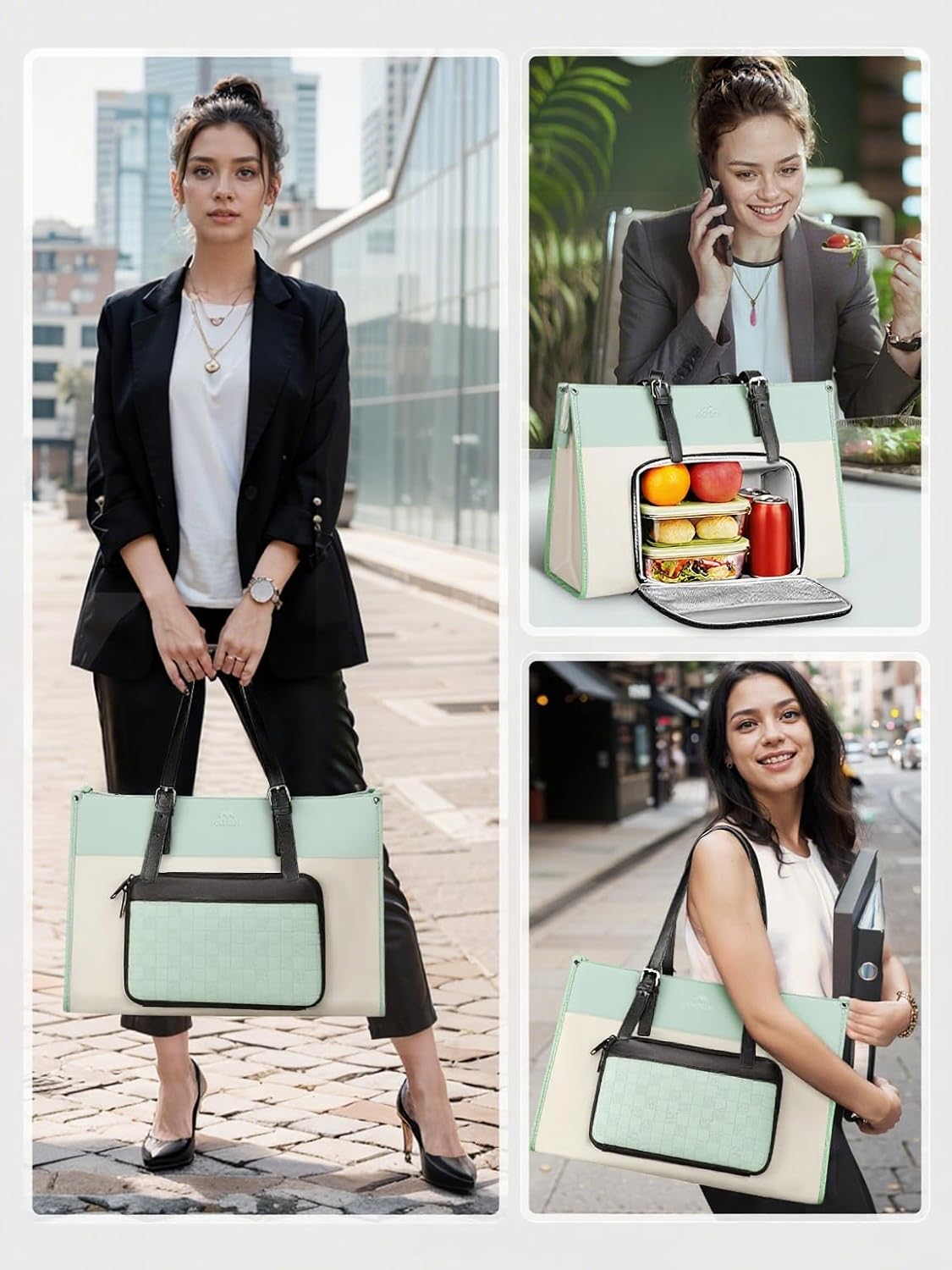 The laptop lunch bag for women keeps food warm for 5 hours and cold drinks for 6 hours.